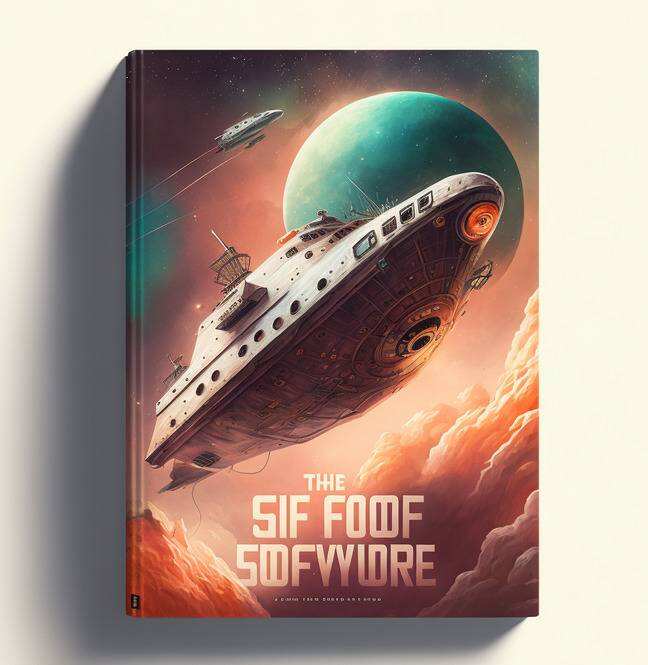 Prompt: old work explorer style ship floating through outer space, 1960s sci – fi book cover