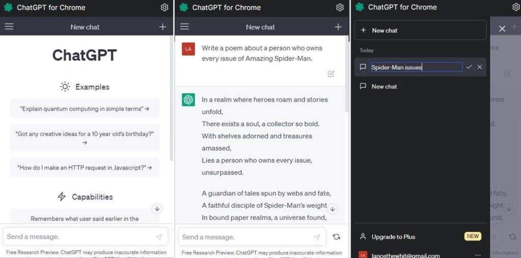 安装并点击该扩展后,你会被要求登录你的OpenAI账户。在提示中键入你的请求,人工智能机器人将作出回应。继续提出更多问题,或点击加号图标开始新的聊天。要访问您的历史,请点击左上角的汉堡包图标。在这里,你可以重命名一个聊天记录或完全删除它。