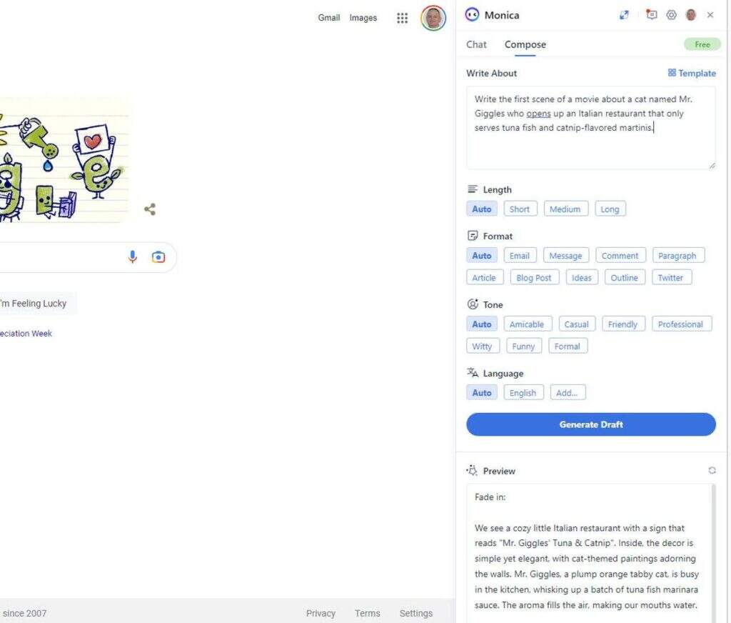 与Merlin一样,你按键盘上的Ctrl+M来触发Monica。界面会在左边的侧边栏中弹出。Monica让你从两种类型的查询中进行选择。聊天模式允许你发布一系列的问题,而撰写模式则允许你要求Monica为你写一些东西。在撰写模式下,你可以通过选择长度、格式、语气和语言来控制回复的类型。选择你想使用的模式,然后输入或说出你的问题。