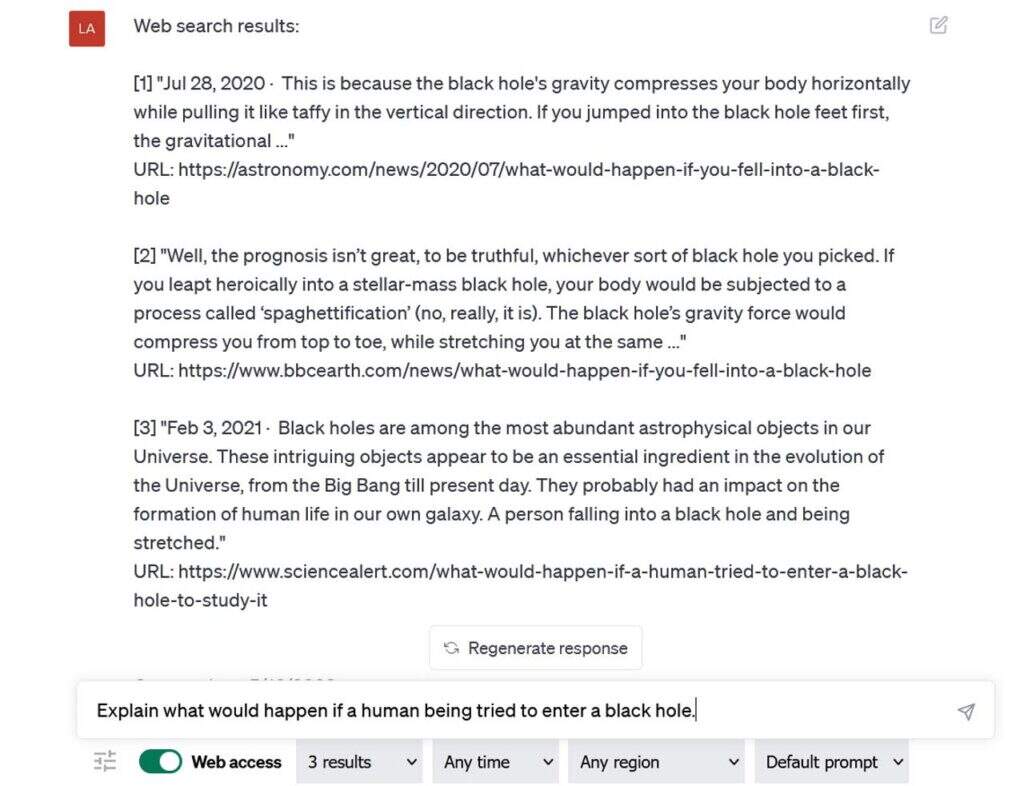 WebChatGPT支持Chrome、Edge和Firefox三个浏览器,它将你带到ChatGPT网站,但通过在回复中包括网络搜索结果来提供一个旋转。在提示中输入你的问题或请求。根据你所寻求的信息,回应将默认显示三个不同网站的链接,然后在其答案中提供进一步的细节。如果您想追踪ChatGPT提供的信息来源,这可能很有帮助。