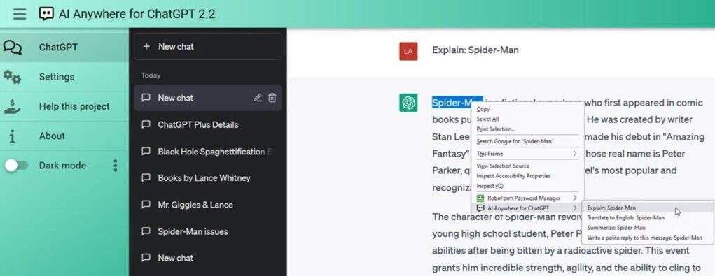 为Chrome、Edge和Firefox设计的AI Anywhere for ChatGPT提供了一个窗口,你可以在其中输入你的请求并看到回应。但更酷的是,该扩展以上下文敏感的方式工作。这意味着,在AI Anywhere激活的情况下,你可以在任何网页上选择和右键单击文本。然后会弹出一个AI Anywhere菜单项,其中包含使用ChatGPT来解释、翻译或总结所选文本的选项。你甚至可以添加你自己的自定义上下文敏感的命令。