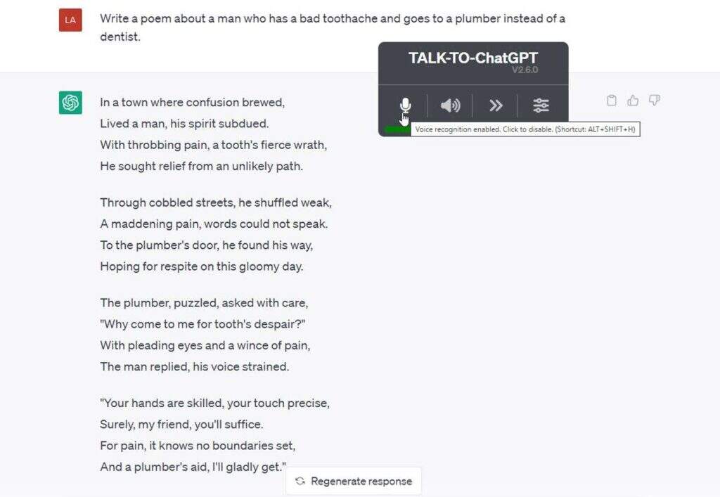 Talk-to-ChatGPT专为Chrome和Edge设计,让你通过说话而不是打字来提交你的请求。安装这个后,登录ChatGPT主页。激活该扩展后,屏幕右上方会出现一个小窗口。点击该窗口的 “开始 “按钮,让你的麦克风进入,然后说出你的请求。ChatGPT的回应就会用文字转语音的方式说出。