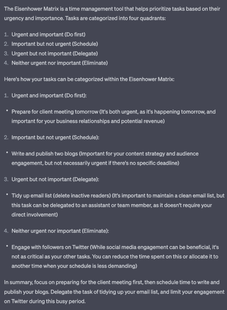 Prompt: "Analyze my tasks below and help me prioritize them using the Eisenhower Matrix:[INSERT TASKS]"