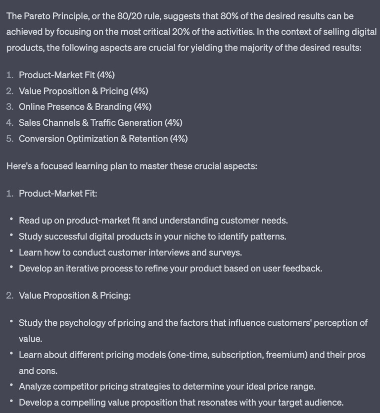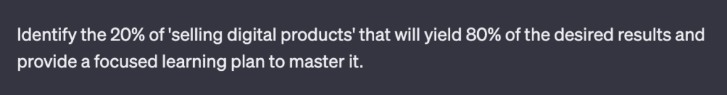 Prompt: "Identify the 20% of [topic or skill] that will yield 80% of the desired results and provide a focused learning plan to master it."