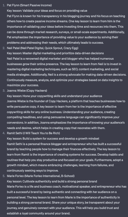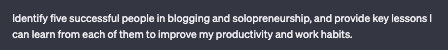 Prompt: "Identify five successful people in [insert your field or industry], and provide key lessons I can learn from each of them to improve my productivity and work habits."