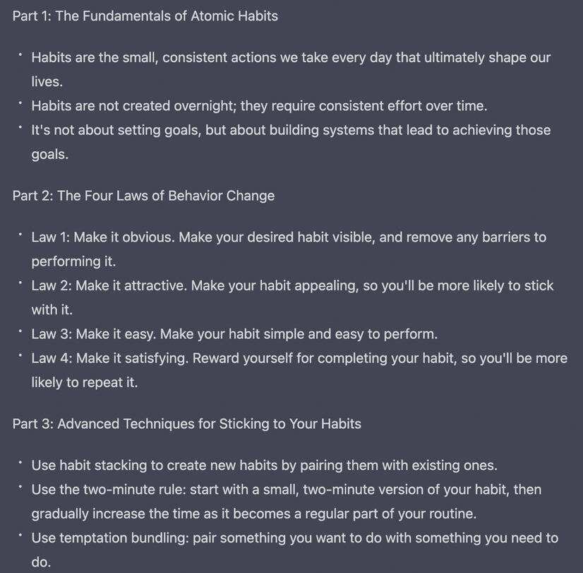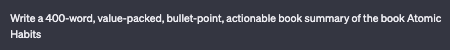 Prompt: “Write a 400-word, value-packed, bullet-point, actionable book summary of the book ‘[BOOK TITLE]'”