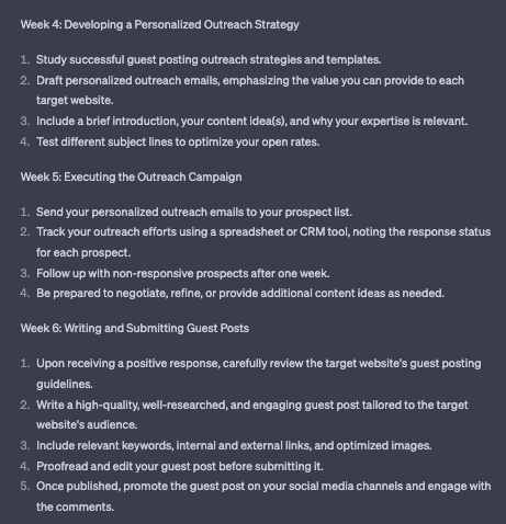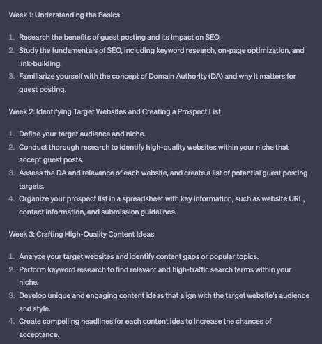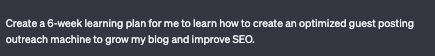 Prompt: "Create a 6-week learning plan for me to learn [insert skill] to [inster goal you want to achieve]”