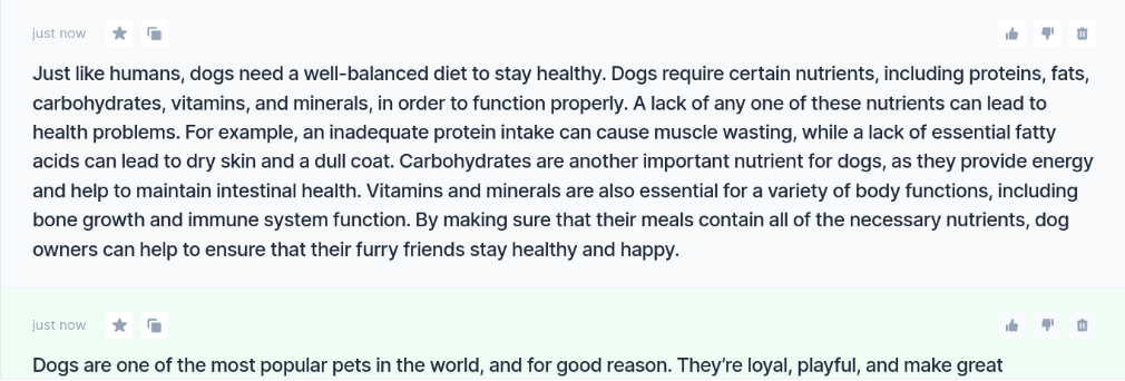 只需将原始文本复制并粘贴到“Content”字段中,选择一种语气,然后单击“Generate All Content”按钮。您的新版本将出现在New outputs窗口中: